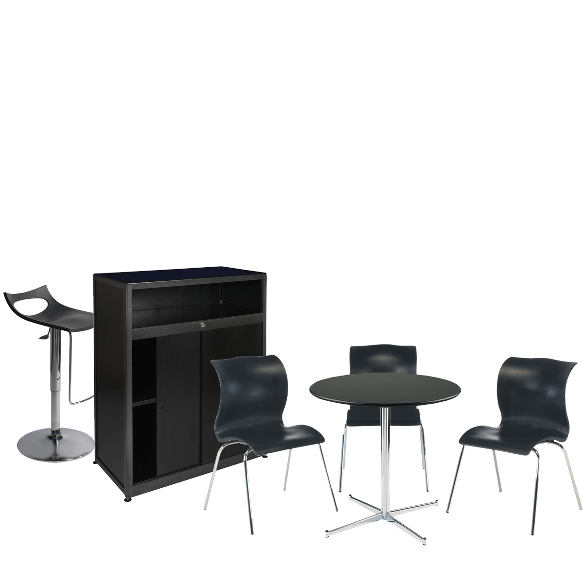NOIR Composition: 1 table, 1 comptoir, 3 chaises et 1 tabouret
