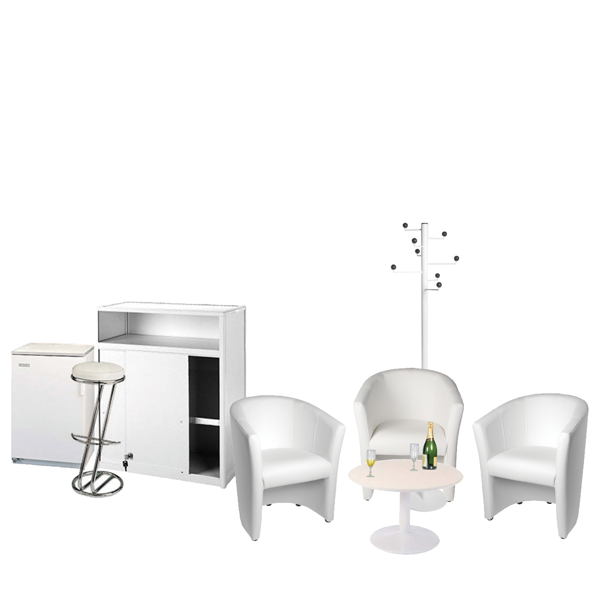 WHITE Composition: 1 low table, 3 armchairs, 1 counter desk, 1 high stool, 1 fridge, 1 coat rack and 1 trash