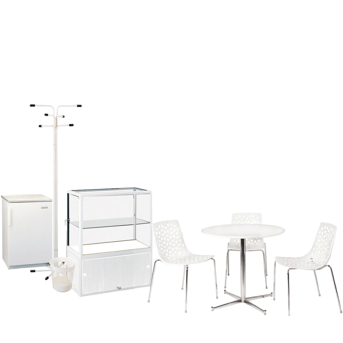 WHITE Composition: 1 table, 3 chairs, 1 showcase, 1 coat rack, 1 fridge and 1 trash