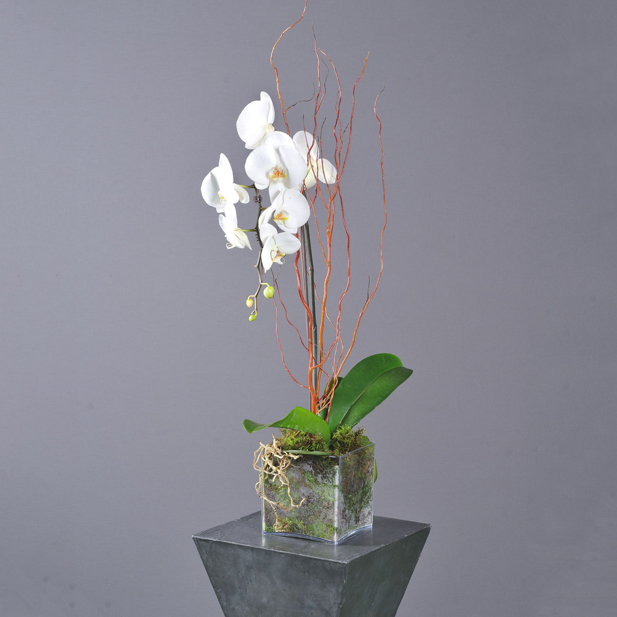 White Orchid & branches of Salix In vessel 10x10x10cm